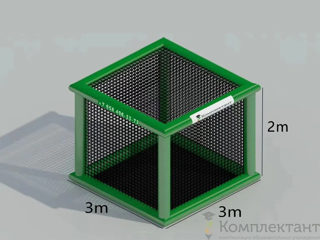 - Сетчатый куб имеет размеры 2м высота × 3м длина × 3м ширина (2×3×3), которые соответствуют требованиям для проведения соревнований по дрон-футболу