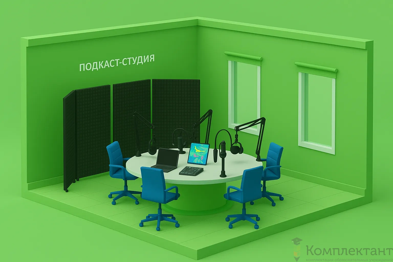 Подкаст-студия укомплектована функционально связанным оборудованием, обеспечивающим полный цикл работы: запись, обработка и публикация аудио- и видеоконтента.