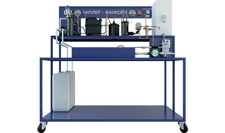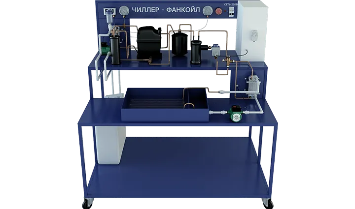 Стенд "Чиллер-фанкойл" демонстрирует работу системы охлаждения воздуха в образовательных учреждениях. Устройство наглядно показывает принцип действия оборудования, упрощая понимание сложных инженерных процессов.