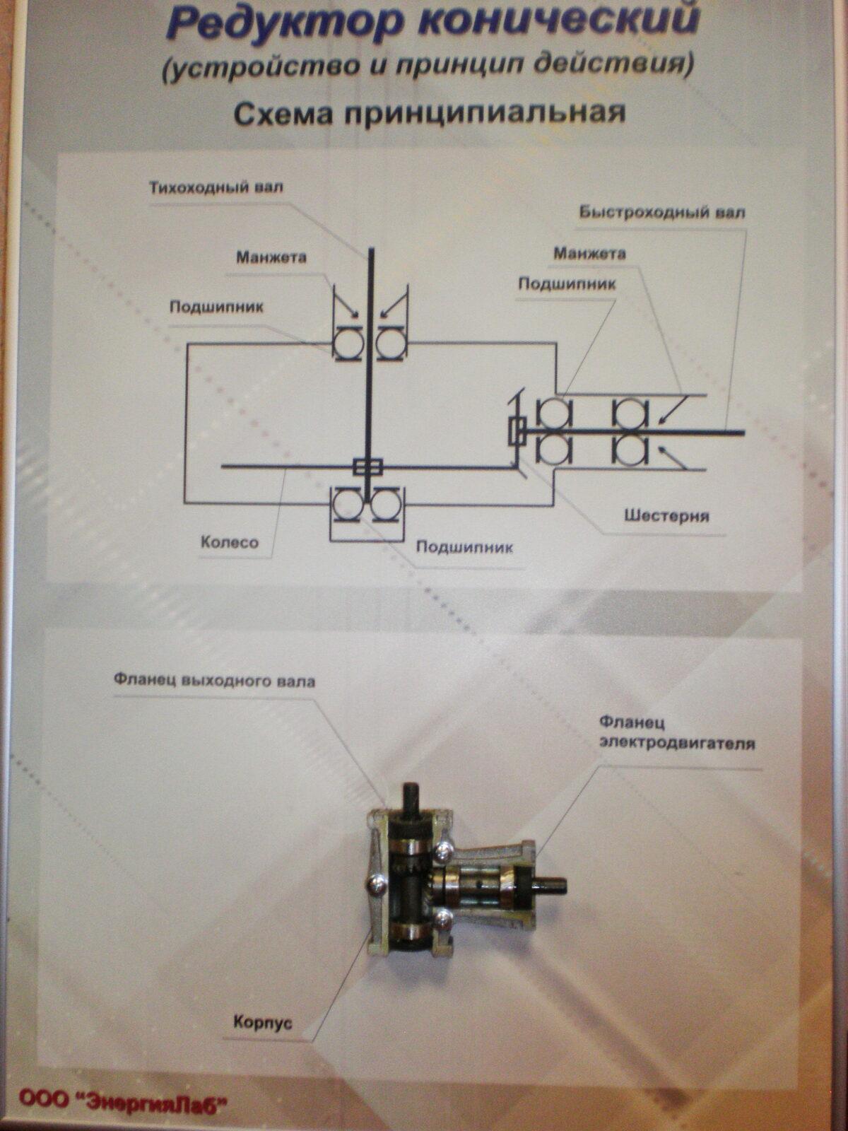 Планшет позволяет изучать устройство конического редуктора,  делать измерения геометрических параметров зацепления определять передаточное отношение методами вращения вала и через числа зубьев колес.