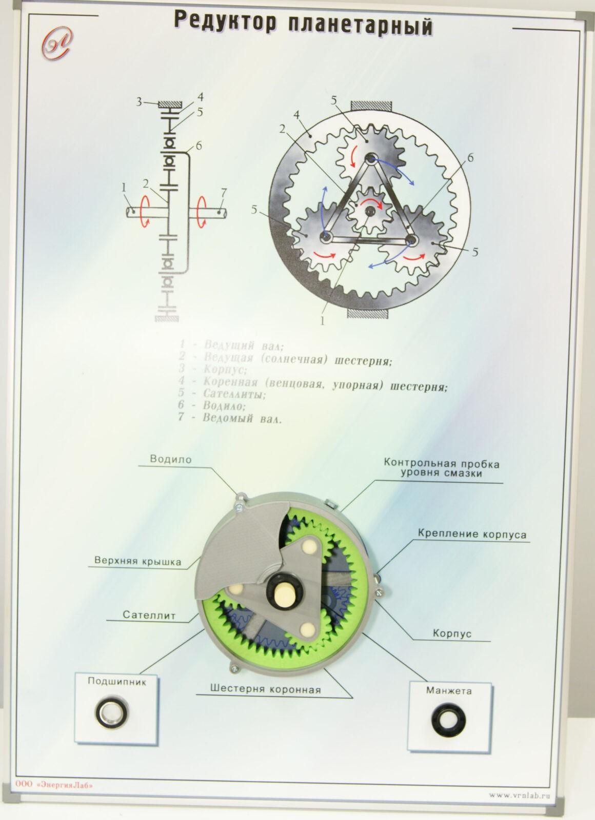 Планшет формата А1 (841x594) с возможностью использования в настенном и настольном вариантах с закрепленным на нем планетарным редуктором - разрез. Возможно изучение устройства редуктора, позволяет делать измерения геометрических параметров зацепления, определять передаточное отношение методами вращения вала и через числа зубьев колес. Планшет выполнен на основе шлифованной фанеры с наклеенным изображением кинематической схемы планетарного редуктора с обозначением элементов. В нижней части планшета закреплена разрезная модель планетарного редуктора. Обрамление планшета выполнено с помощью алюминиевого профиля.