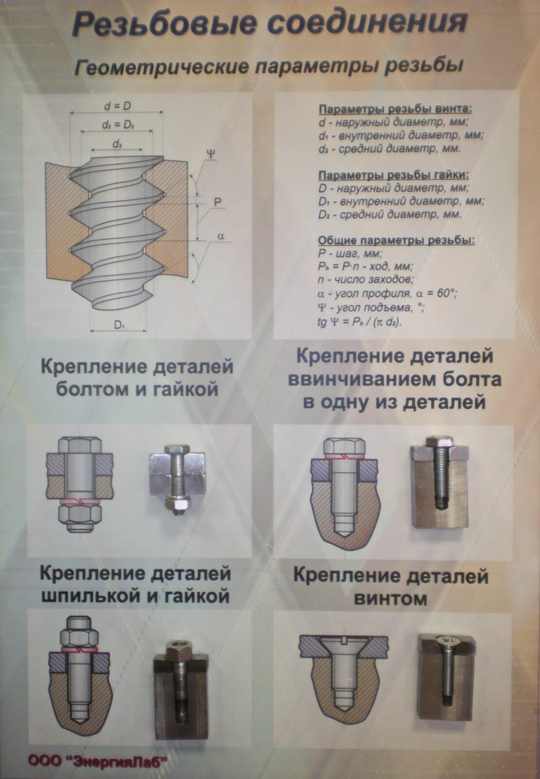 Планшет формата А2 с возможностью использования в настенном и настольном вариантах. На планшете даны основные геометрические параметры резьбы, схема и образцы типовых резьбовых соединений изготовленных из металла (сталь-алюминий):
