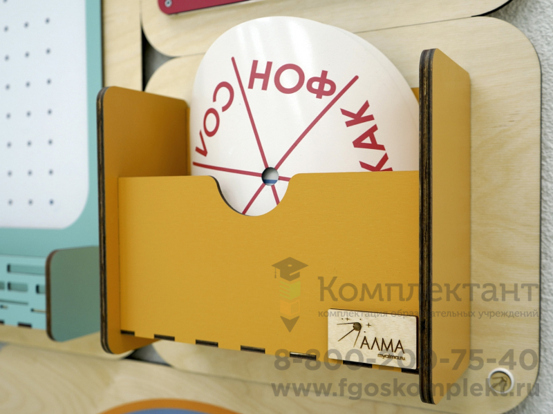 - Модуль «Слоги» со сменными магнитными дисками. Помогает логопеду работать с нарушениями звуко-слоговой структуры слов у ребёнка. На дисках представлены слова с разными типами слоговой структуры, с возрастающей степенью сложности (открытый и закрытый, слог со стечением согласных и без него). Каждая пара в своем цвете, чтобы педагогу было легче найти пары.