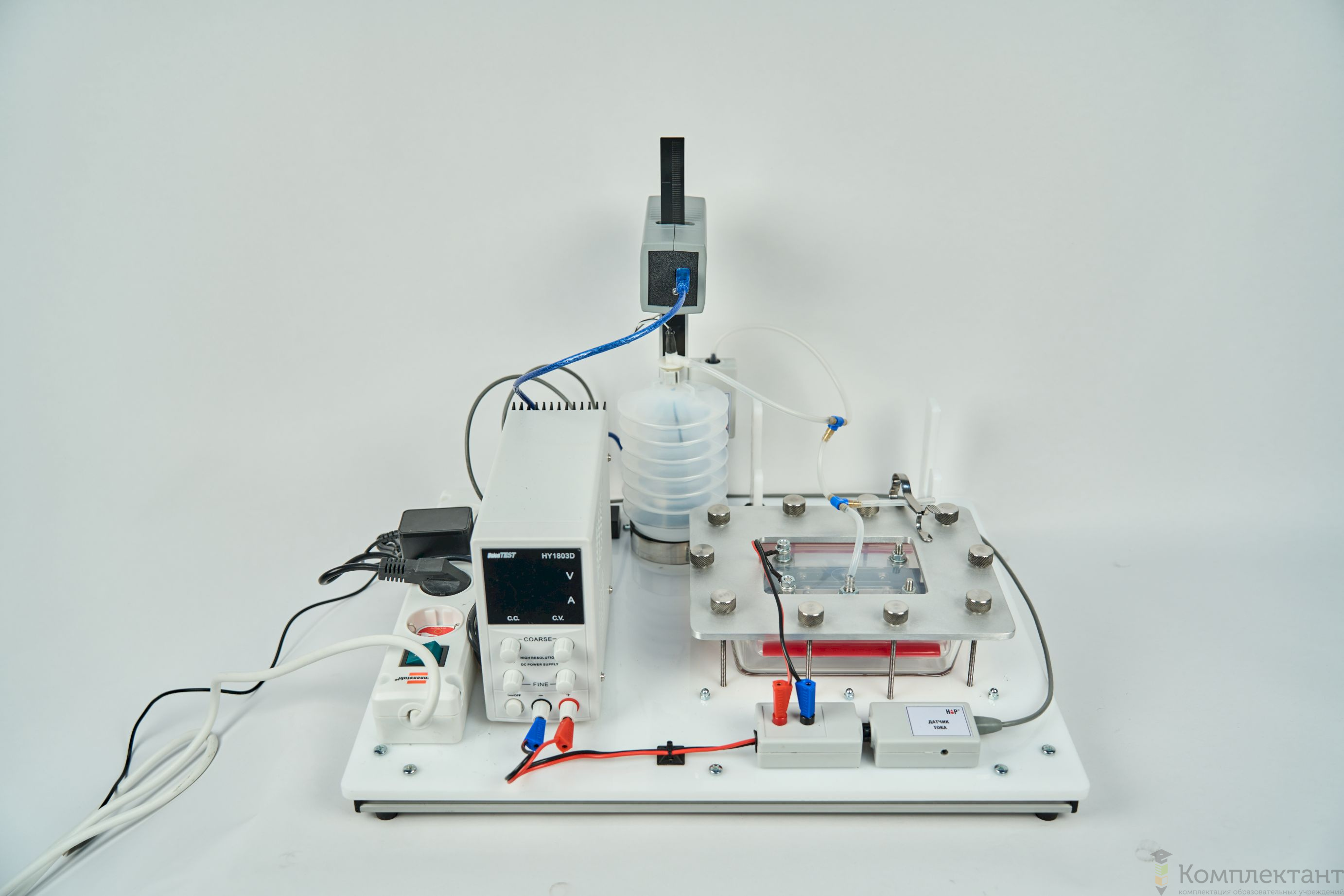 Лабораторная установка представляет собой электролизёр (резервуар с крышкой, на которой смонтировано два электрода; крышка прижимается к сосуду при помощи специального фланца с винтами). Гибкая трубка из электролизёра соединяется с датчиком объёма газа с контролем температуры и датчиком абсолютного давления. Таким образом можно одновременно контролировать изменение объёма, давление и температуру газа. Трубка имеет отвод, который перекрывается зажимом. Электроды электролизёра через клеммы и датчик силы тока подключены к блоку питания. Все датчики установки подключены к USB-разветвителю.