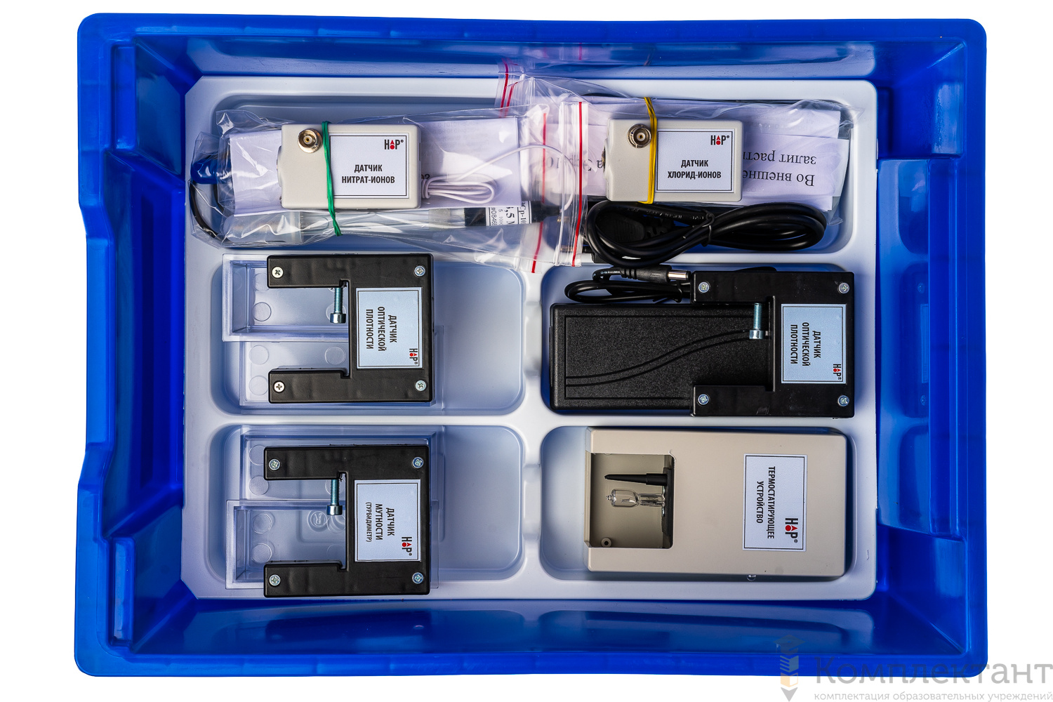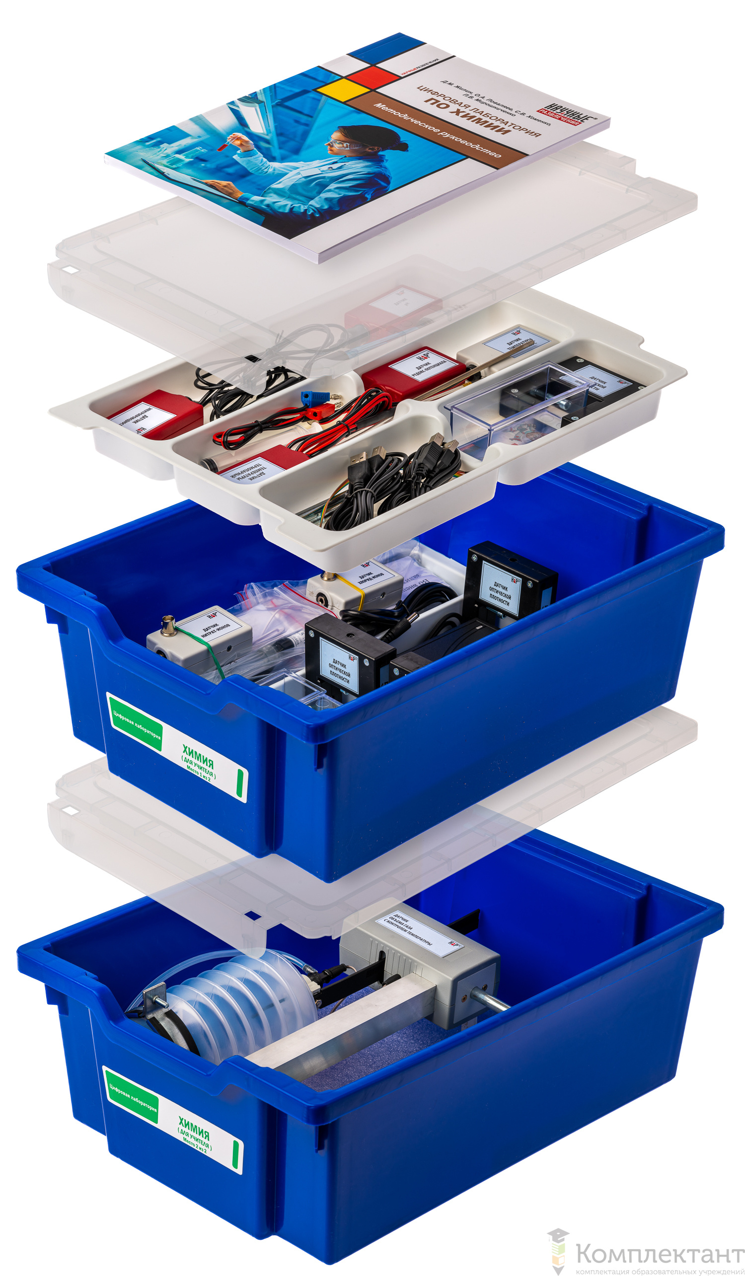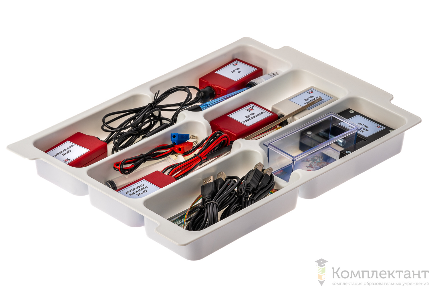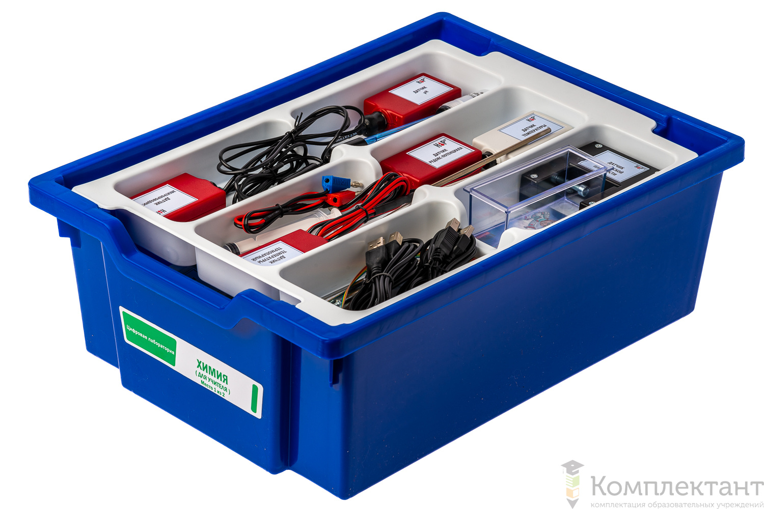 Цифровая лаборатория укомплектована в пластиковую систему хранения, которая закрывается прозрачной пластиковой крышкой на защелках для обеспечения наблюдения за содержимым. Комплект оборудования и датчики в системе хранения располагаются на ложементах.