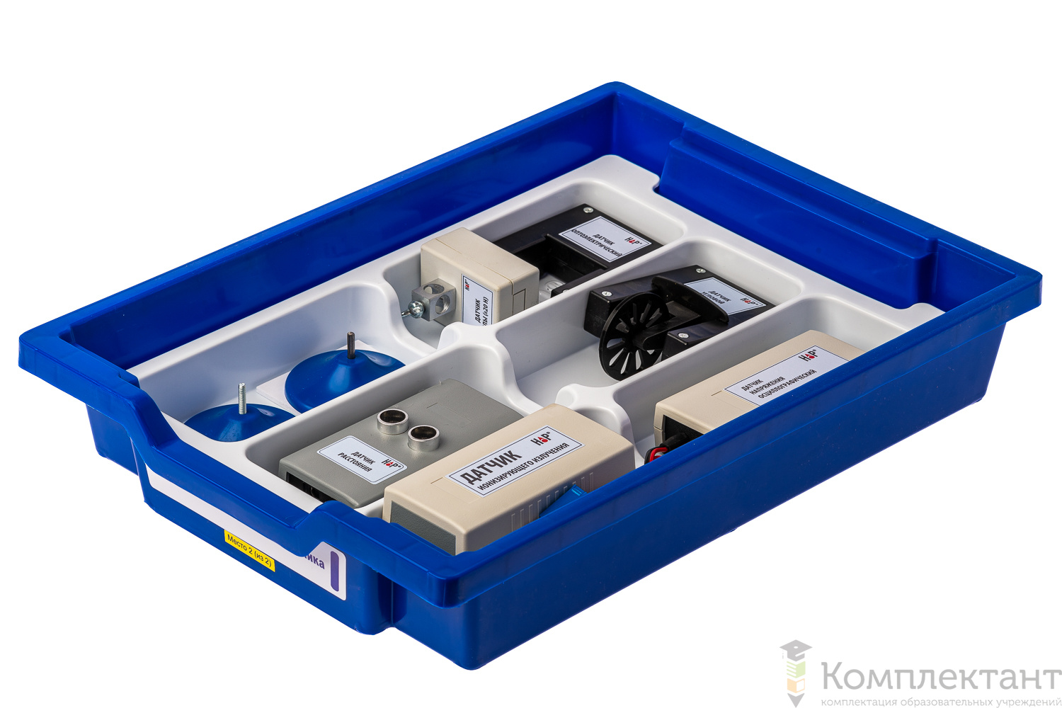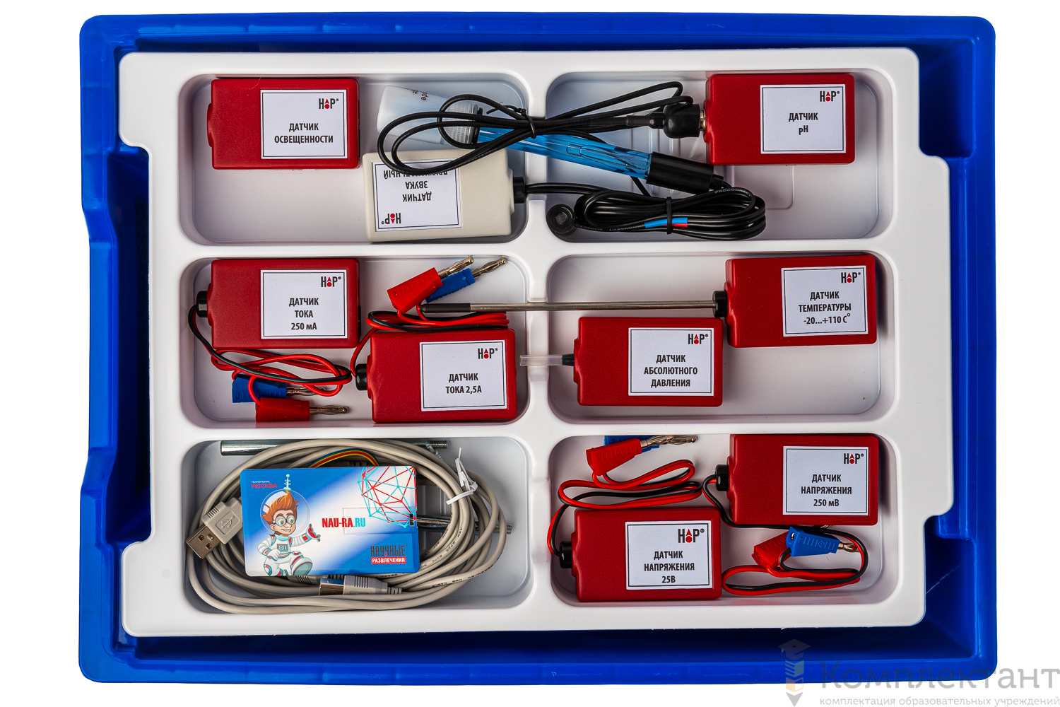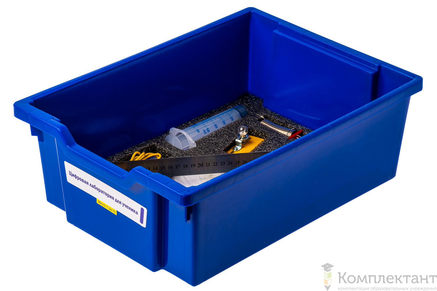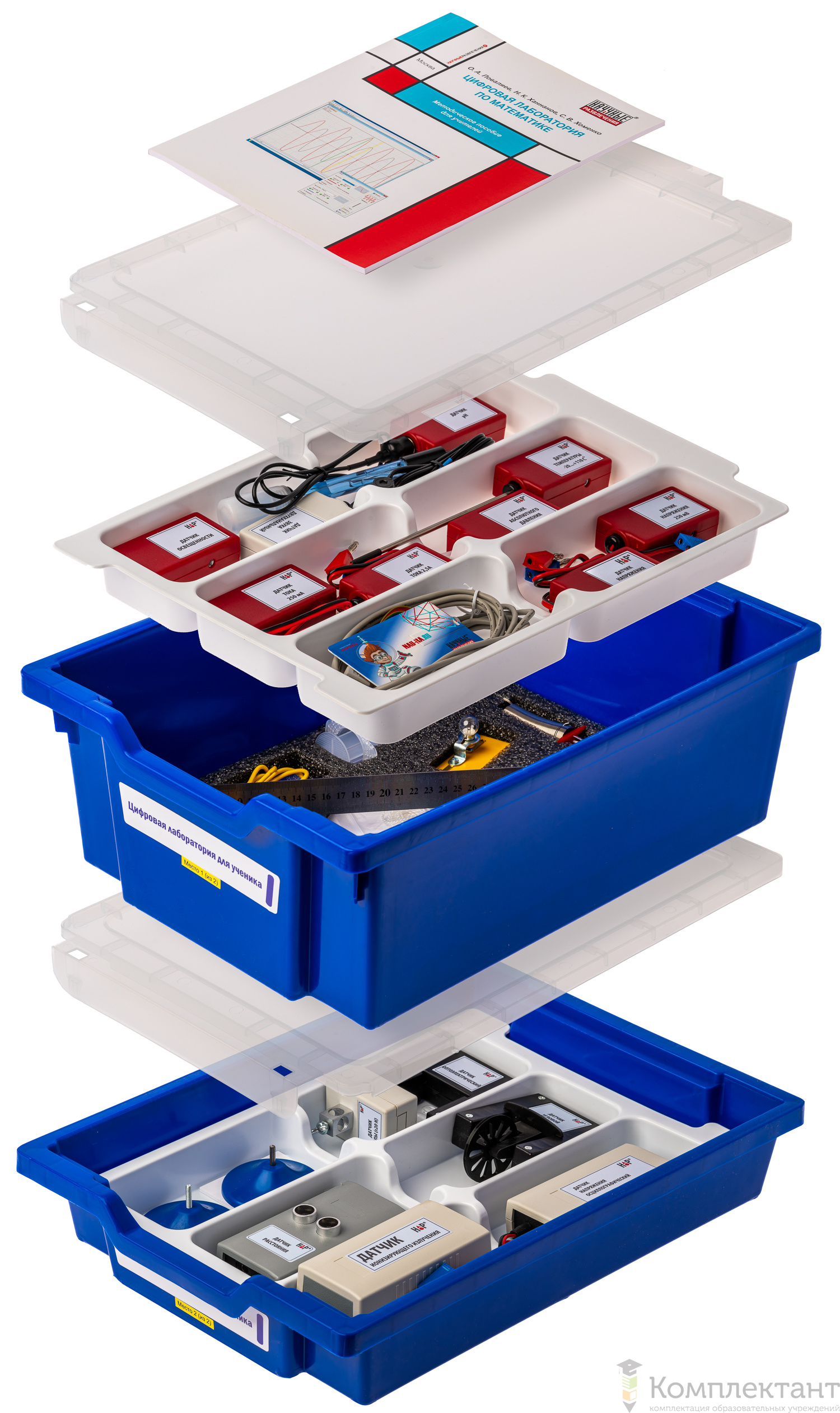 Все оборудование цифровой лаборатории укомплектовано в пластиковую систему хранения, которая закрывается прозрачной пластиковой крышкой на защелках для обеспечения наблюдения за содержимым. Комплект оборудования и датчики в системе хранения располагаются на ложементах в индивидуальных ячейках.