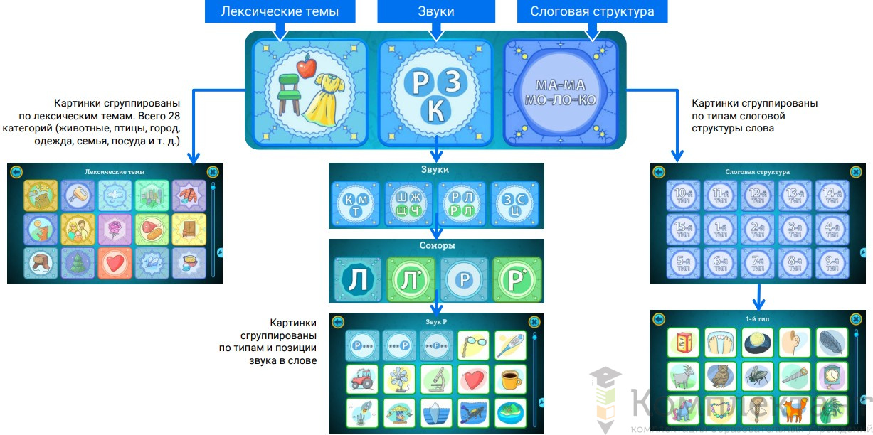 — Более 400 тематических картинок для изучения основных лексических тем, отработки звуков, а также слов разных типов слоговой структуры