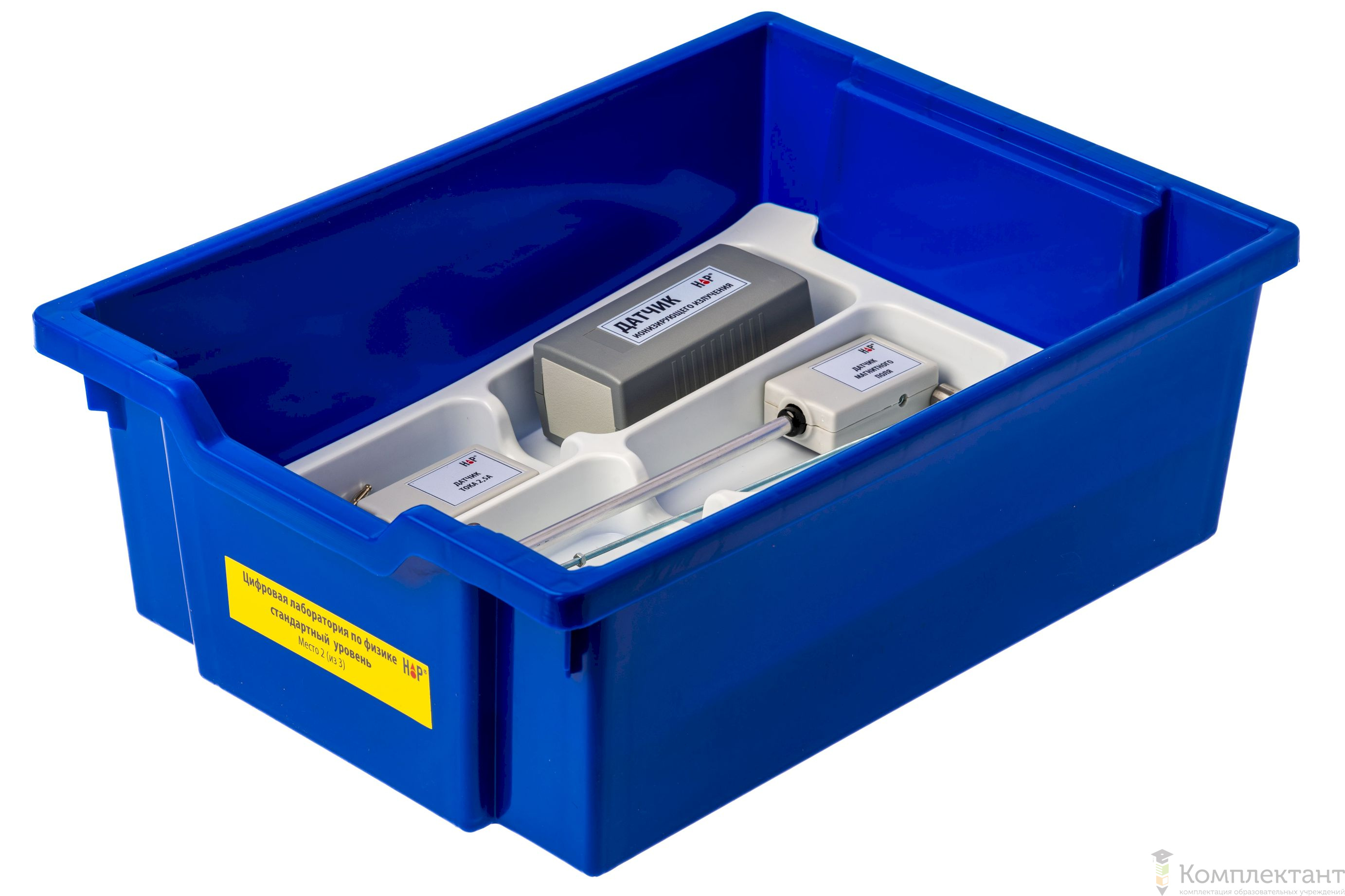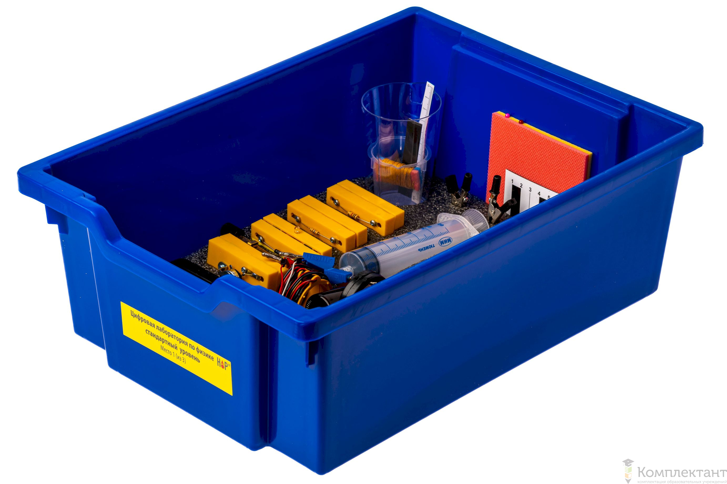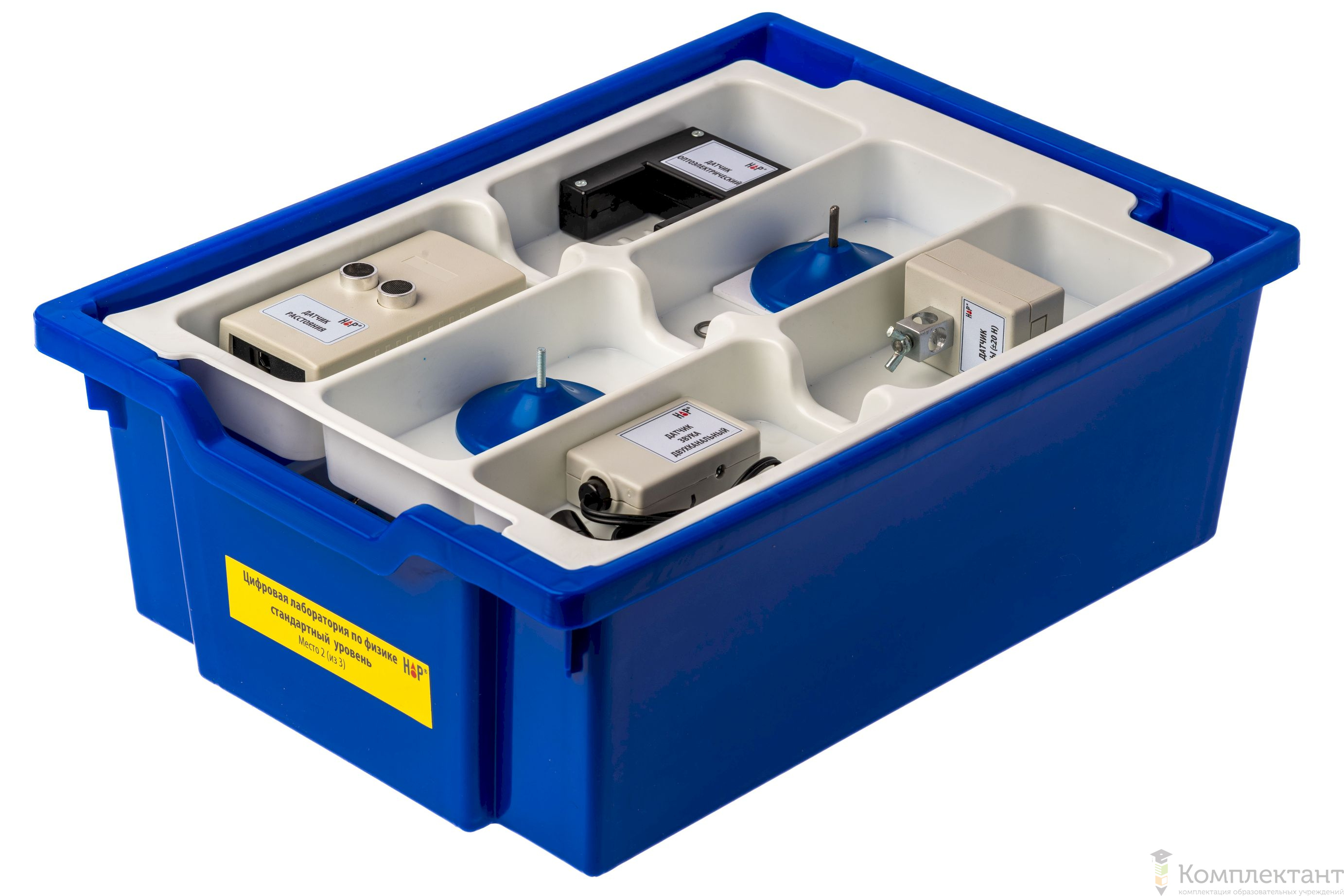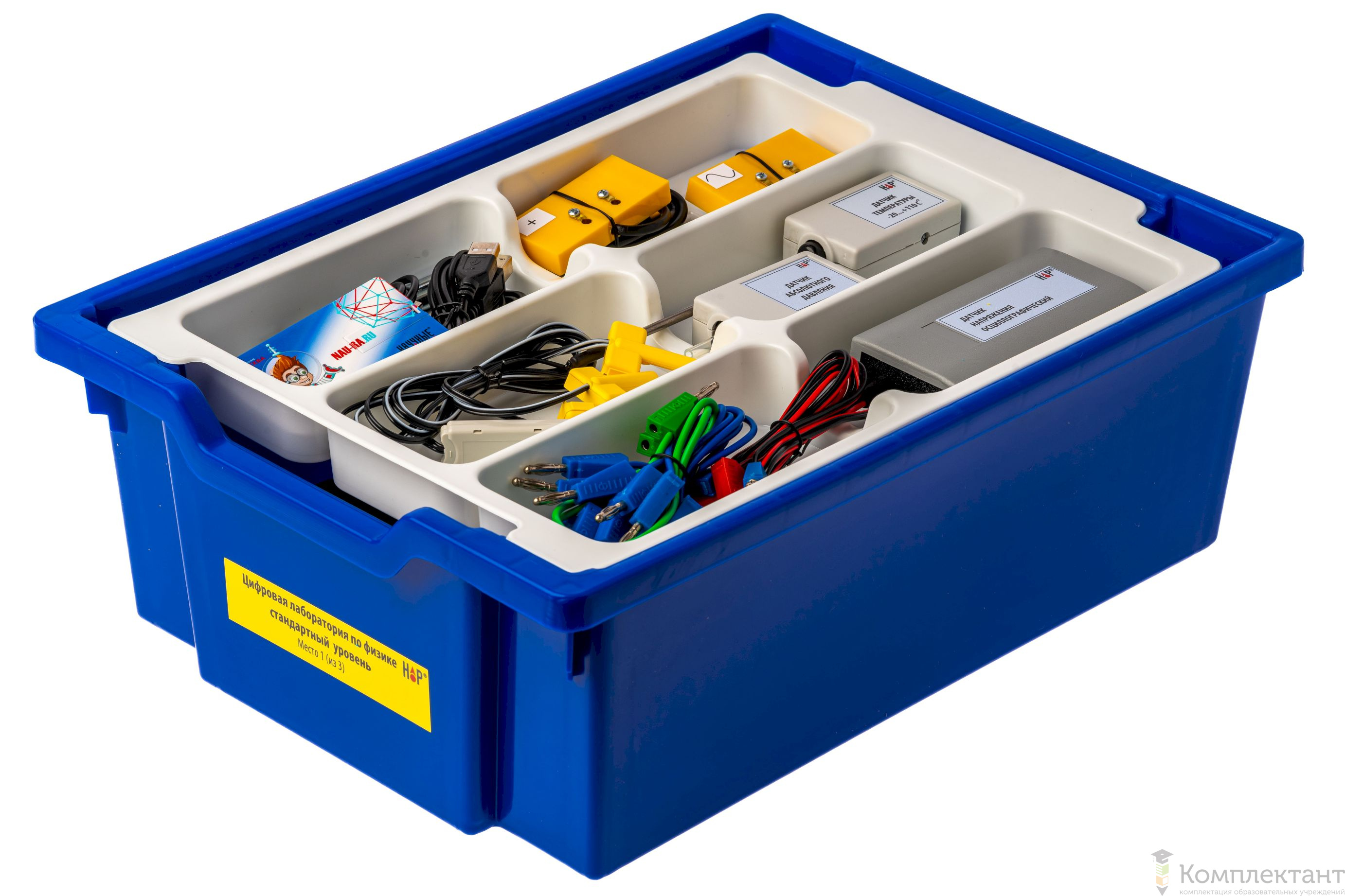 Все оборудование цифровой лаборатории (кроме скамьи лабораторной) укомплектовано в пластиковые системы хранения, которые закрываются прозрачной пластиковой крышкой на защелках для обеспечения наблюдения за содержимым. Комплект оборудования и датчики в системах хранения располагаются на ложементах в индивидуальных ячейках.